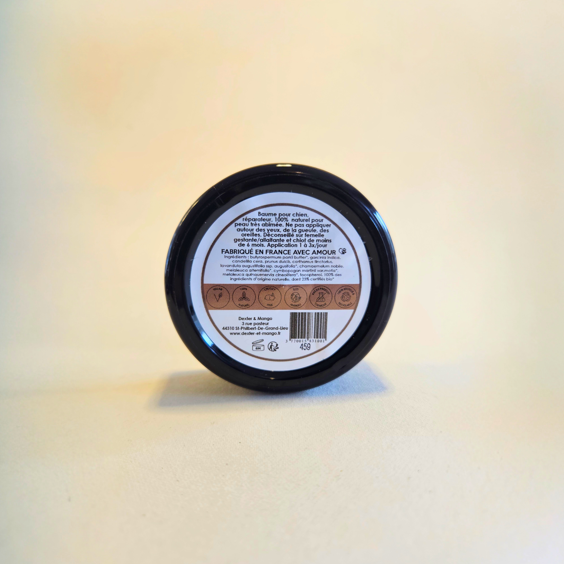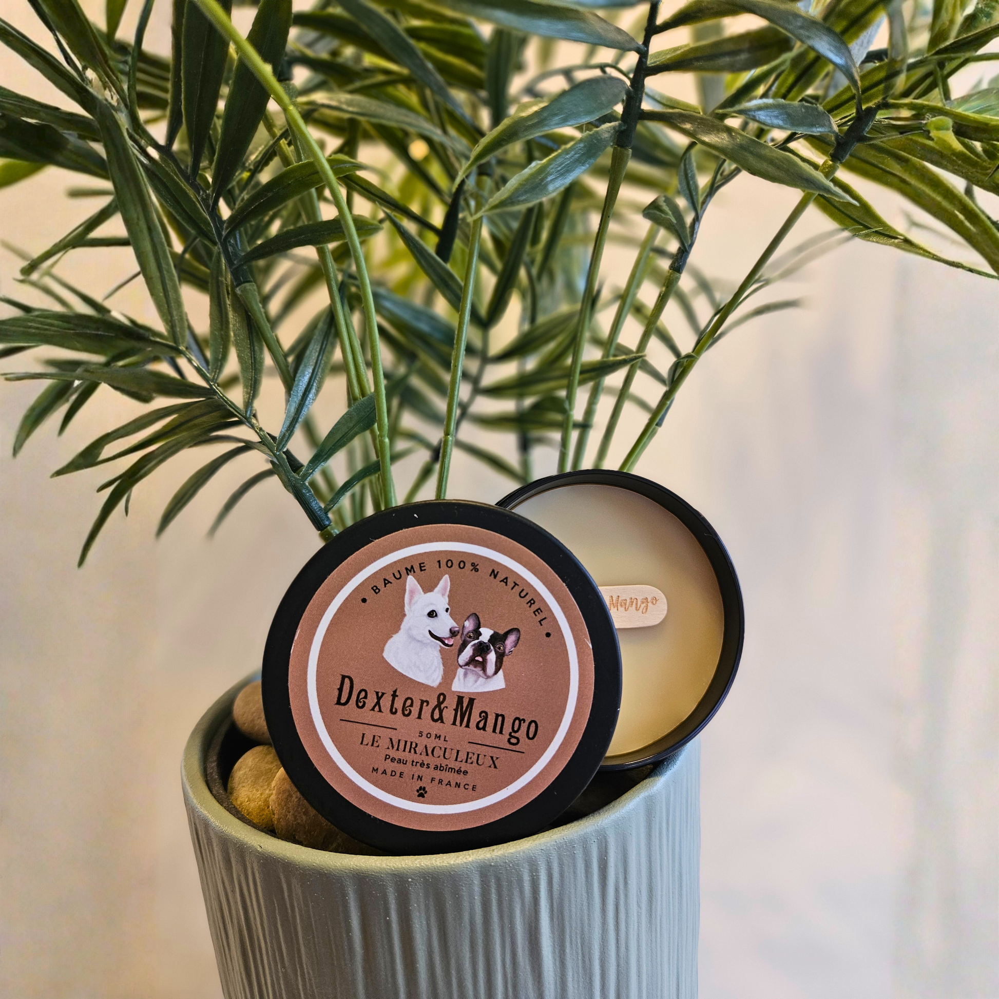 La formule du baume Le Miraculeux est 100 % naturelle et vegan, élaborée à partir de beurres végétaux nourrissants, d’huiles végétales adoucissantes et d’huiles essentielles bio aux propriétés réparatrices et purifiantes. Chaque ingrédient est soigneusement sélectionné pour respecter la peau sensible des chiens et garantir une efficacité optimale, sans compromis sur la sécurité.