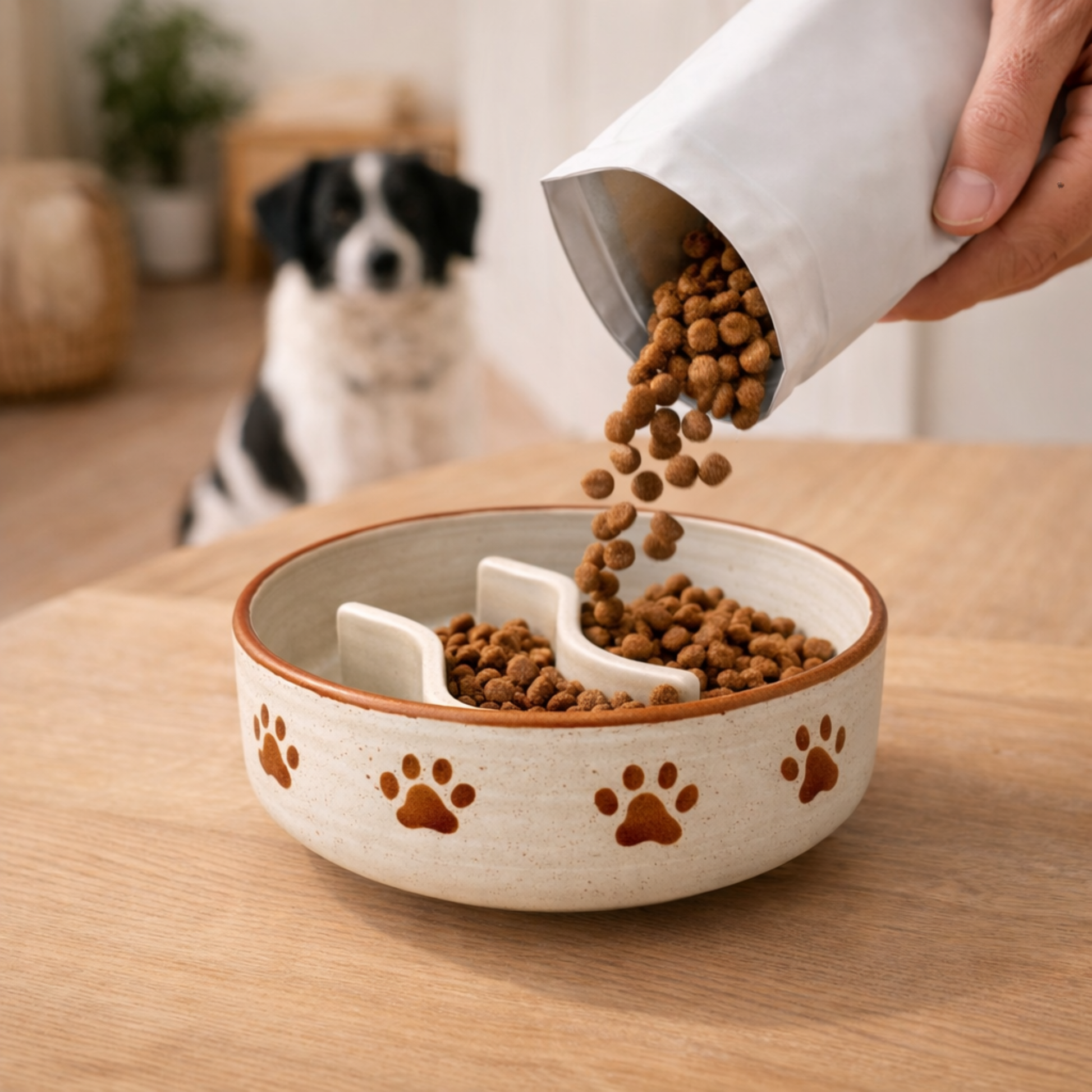 Transformez les repas de votre compagnon en un moment plus sain, plus calme et plus joli : commandez dès maintenant votre gamelle anti-glouton aux pattes marron.